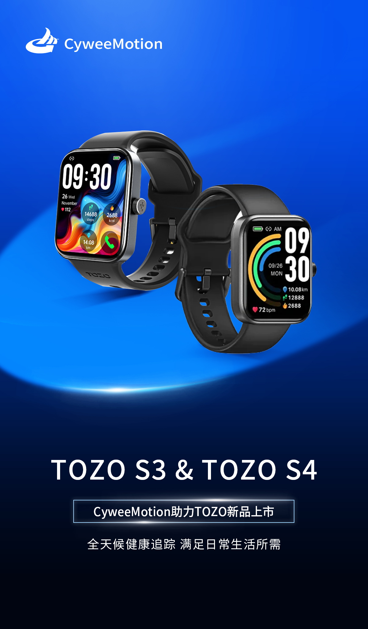 作为智能手表手环领域新星,TOZO需要打造更优质的产品和服务,才能在市场上获得更强的竞争优势。因此,TOZO在对于供应商的选择上也极为严谨,技术门槛要求较高。CyweeMotion长期致力于体感运动的开发,拥有近20年传感器讯号处理经验,量产设备近1.5亿台,并率先搭建Machine learning的算法模型,将每个功能的特征值进行人工智能学习,实现高效开发,可为客户提供高精准、高稳定性的运动监测解决方案。基于为用户提供高品质产品的共同目标,TOZO与CyweeMotion(咸兑科技)携手合作,共同推出TOZO S3、TOZO S4两款智能手表,以全天候健康追踪解决方案赋能全新产品,满足海外市场需求。TOZO S3/S4 均拥有100+种运动模式,同时搭载了CyweeMotion(咸兑科技)的全天候健康追踪解决方案,可满足用户日常生活及专业运动需求。全天候健康追踪解决方案可支持用户支持用户进行抬腕唤醒、生活计步、睡眠监测等活动,通过先进的算法和高精度的感测能力,能够实时监测并收集用户的健康数据,为用户的健康保驾护航。CyweeMotion(咸兑科技)的抬腕唤醒功能基于体感动作识别,可在日常使用或运动中,帮助用户更为方便地查阅时间、信息等。我们在该功能上,针对日常生活中常见场景(如:站立、静坐、办公、出行、运动及睡眠等)及不同的抬腕速度进行优化,能达到较快的响应速度。走路是最佳的健康投资方式,智能手表中的基础计步功能会激发人们变得更加热爱运动。CyweeMotion(咸兑科技)的计步功能已针对70+种生活场景进行优化,比如提包走路、撑伞走路、手肘挂包走路、手插裤子口袋走路等场景,可达到高精度标准,令用户走的每一步都算数。