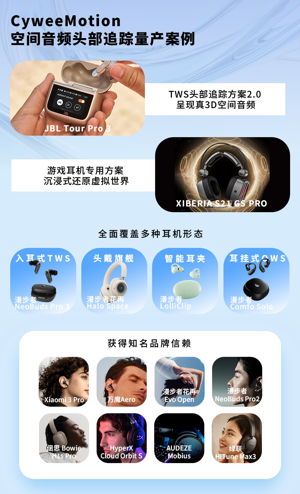 CyweeMotion空间音频头部追踪解决方案支持多种芯片平台,可实现跨平台快速部署,同时可集成第三方3D环绕音效,为终端品牌厂商提供可快速落地的空间音频解决方案。目前,CyweeMotion的空间音频头部追踪方案已获得JBL、漫步者、倍思等多个知名音频品牌采用,并量产于TWS耳机、耳挂式/耳夹式OWS耳机、头戴式耳机、游戏耳机等多种耳机形态与品类,量产经验丰富,得到市场验证。