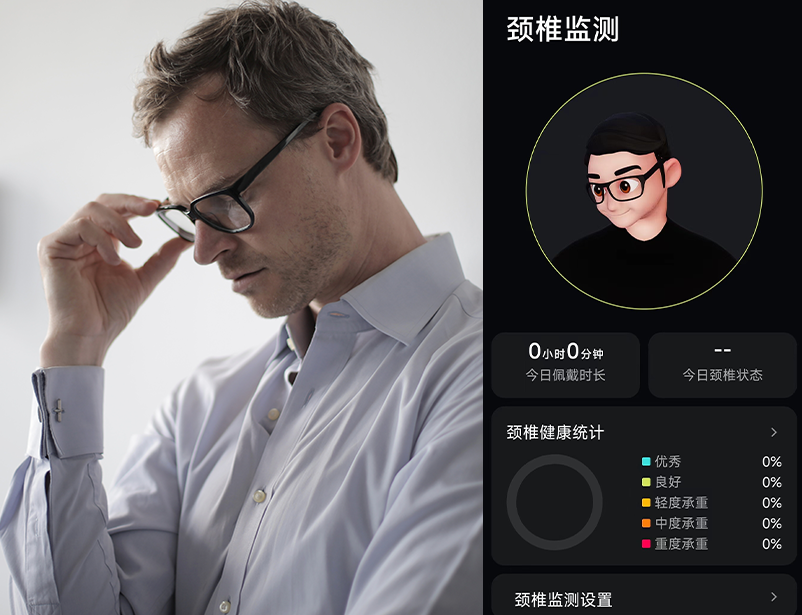 对于上班族来说,长期低头久坐,颈椎问题成为常见的现象。MIJIA智能音频眼镜搭载了CyweeMotion六轴融合技术,能对用户进行颈椎监测,监测用户颈椎的承重情况,进行颈椎健康统计。当用户进行长时间低头伏案办公或者沉迷游戏时,眼镜可自动识别并记录颈椎状态,并给出合理的范围值,适时对用户进行提醒。