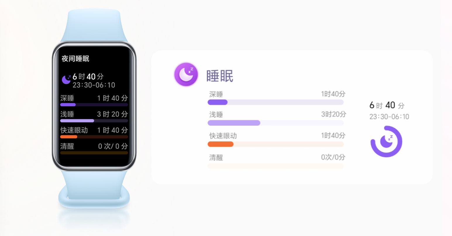 CyweeMotion(咸兑科技)为荣耀手环9提供全天候睡眠监测解决方案,零星小睡也能自动记录。长时间睡眠支持监测输出睡眠阶段数据、睡眠评分等,帮助科学评估睡眠状态、分析睡眠质量。智能闹钟功能结合睡眠阶段监测,计算更佳唤醒时间,改善早起精神状态。