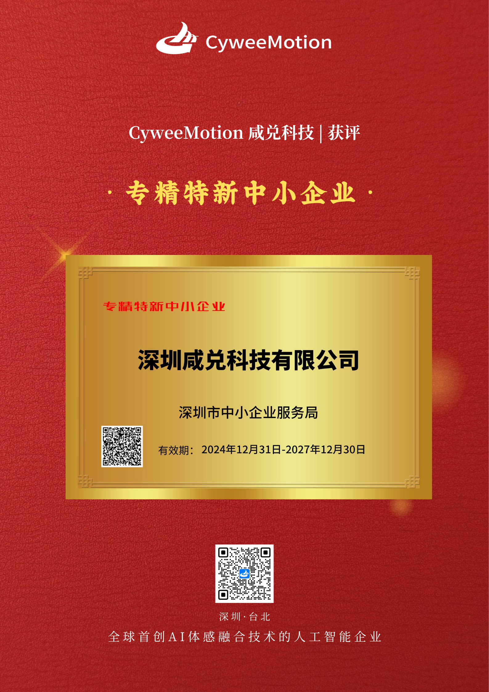 CyweeMotion(咸兑科技)作为全球AI体感交互领域的标杆企业,成功通过国家级【高新技术企业】认定及深圳市【专精特新中小企业】认定。——此次荣誉不仅是对CyweeMotion技术实力的权威认证,更是对我们推动智能穿戴行业智能化升级的高度肯定。未来,公司将继续以创新驱动发展,为全球用户提供卓越的运动健康体验。